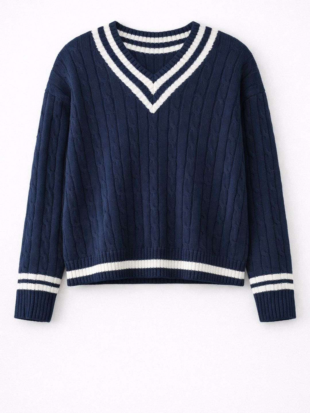 - Decolteul în V este evidențiat printr-un tiv contrastant, care conferă puloverului un aspect atemporal și ușor sportiv.